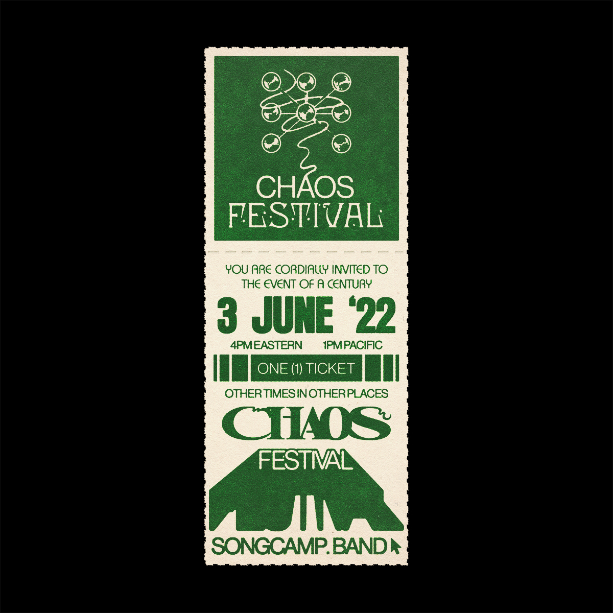 This ticket grants one (1) entry into Chaos Festival*. Chaos Festival marks the debut NFT Collection release from Chaos β a headless band of 77 artists. *Note: While a ticket is not mandatory to access this event, ticket holders who attend the event will enter into a chance to receive a special gift during the festival. Friday June 3 at 4:00PM ET Chaos Stage; Songcamp Discord RSVP at https://lu.ma/chaosfestival