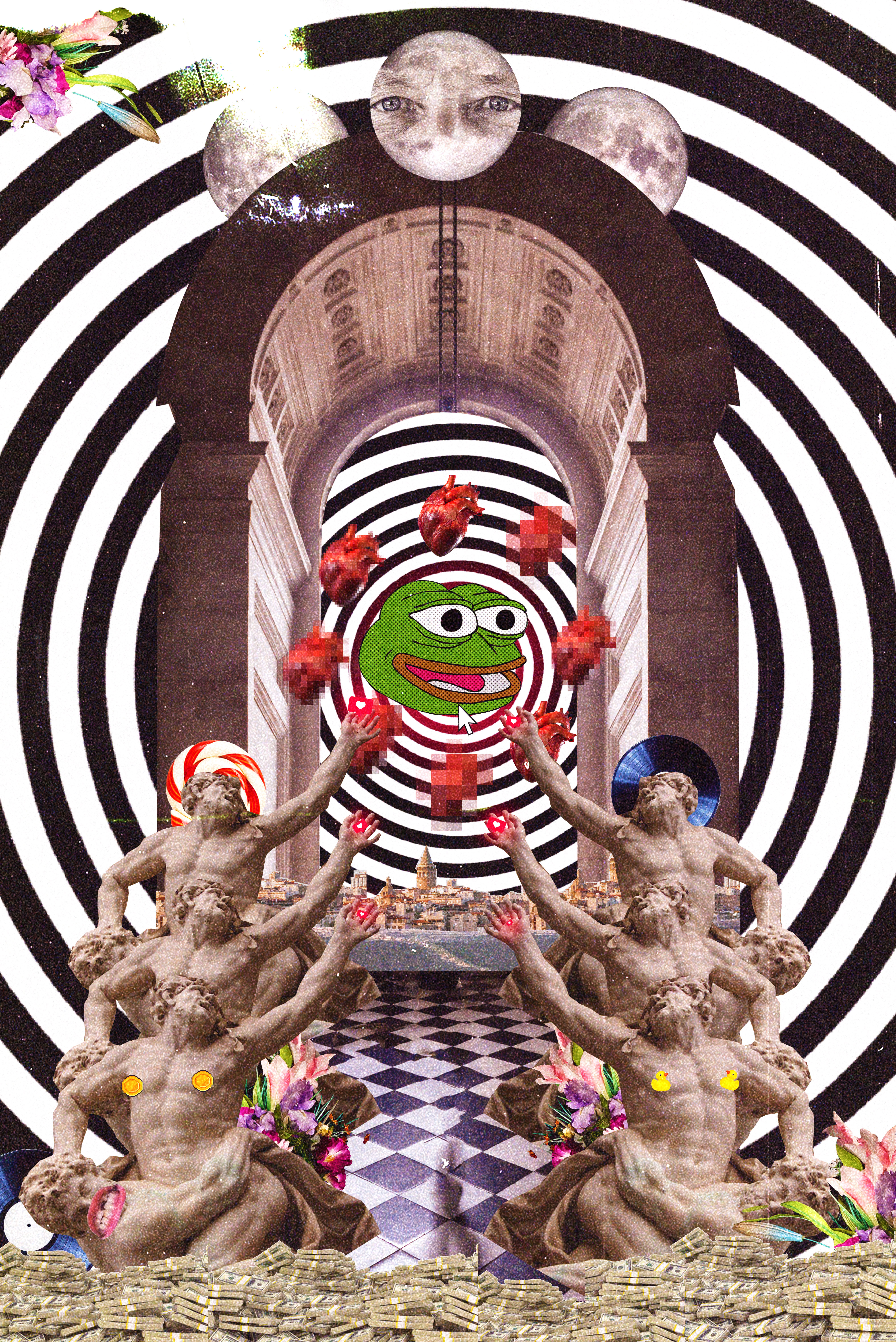 Photonisdead released a CCO version of his famous Black & White spiral, and Pepe Le Spiral is me exploring my new found love for collage and cryptoart. Featuring the infamous Pepe Frog meme. This will be a gateway into my new pieces. There is an unlockable gif that will be minted later to