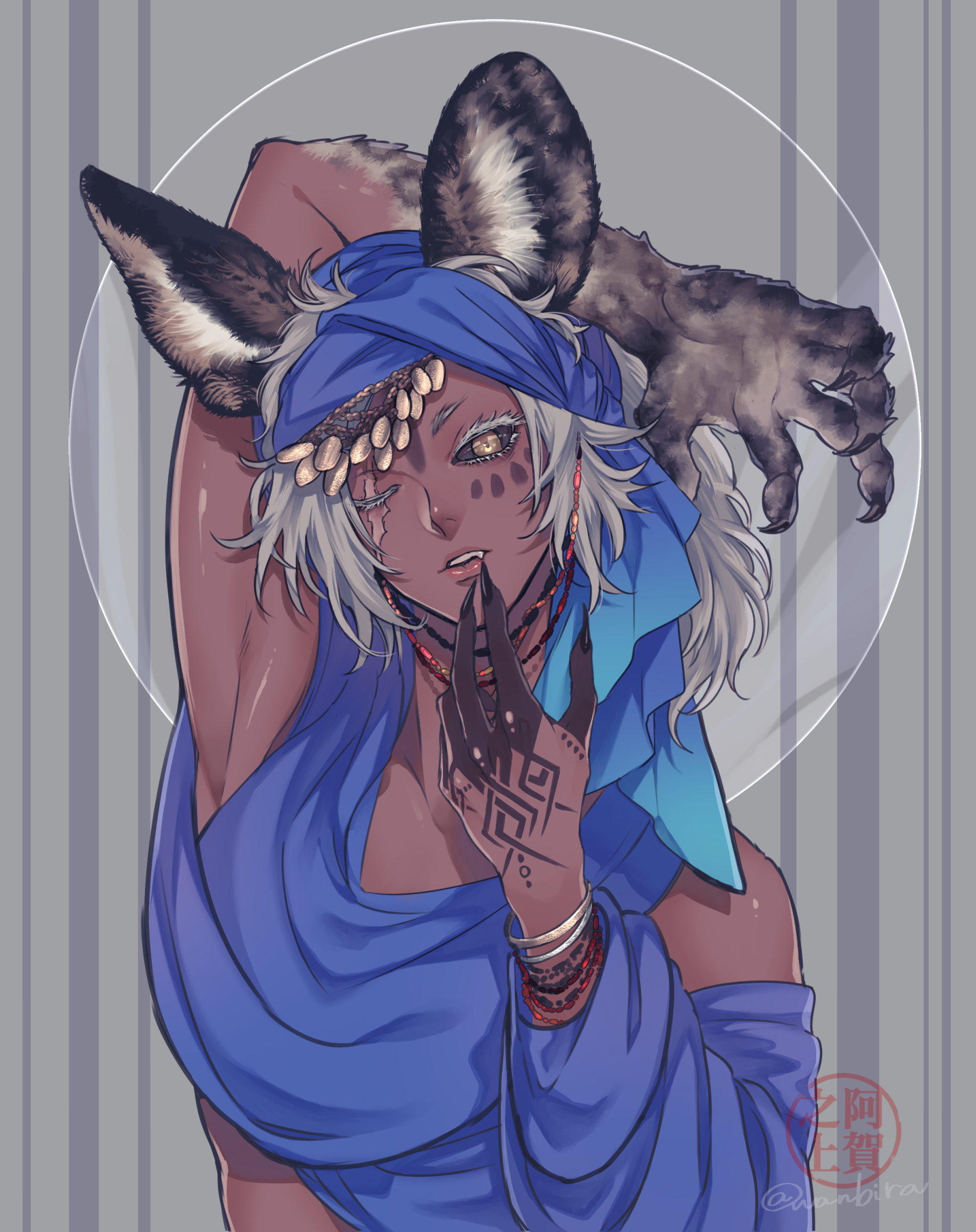 He is a beastman of African wild dogs and lives in downtown. He likes to draw patterns on his skin like tattoos.