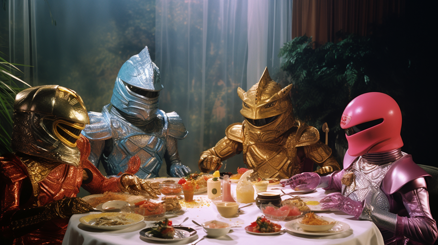 A Certain Sunday is a collection of post-photography works by artist Denjin-K that draws inspiration from the rich and diverse world of Japanese Tokusatsu live-action film and TV. The collection reimagines situations like rangers and monsters together enjoying elegant dinner parties, casual rendezvous, or slice of life scenarios, all set in 60s and 70s-era living rooms, lounges, and kitchens. The aesthetic of the artwork is reminiscent of retro film, creating a unique nostalgic atmosphere.