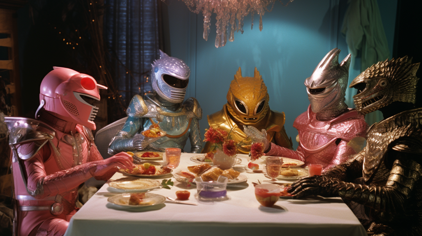 A Certain Sunday is a collection of post-photography works by artist Denjin-K that draws inspiration from the rich and diverse world of Japanese Tokusatsu live-action film and TV. The collection reimagines situations like rangers and monsters together enjoying elegant dinner parties, casual rendezvous, or slice of life scenarios, all set in 60s and 70s-era living rooms, lounges, and kitchens. The aesthetic of the artwork is reminiscent of retro film, creating a unique nostalgic atmosphere.