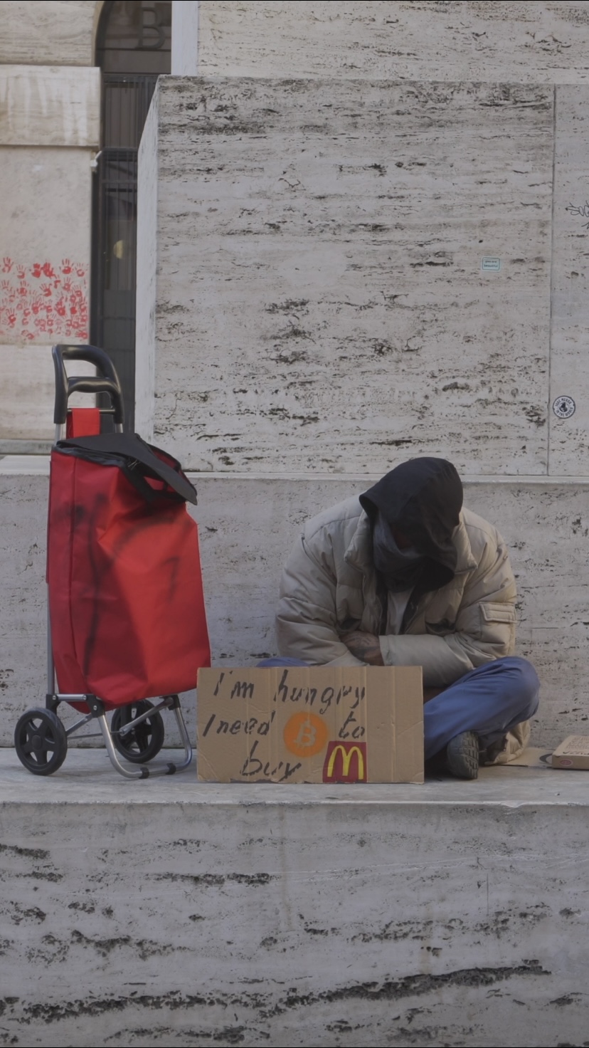 CRYPTO/clochard 3/9 NFT This is a Third of Nine NFT Works extracted from the performance shot on 8 and 9 October 2021 and the Artist exhibits a provocative sign in which he explicitly asks for the best known currency for eating at McDonald's "Will using crypto currencies enter our daily life as well as eating a Big Mac? All the shots and videos were shot in utmost secrecy, so that none of the passers-by would notice anything and were faced with something unexpected and unreal, so as to arouse in the observers a sense of amazement and disbelief, as you will see in the other NFTs. In this NFT, the Artist asks for alms under the sculpture L.O.V.E. by the well-known Italian Artist Cattelan Those who purchase the NFT will also have the framed, authenticated painting of the same cardboard that the Artist used in the performance in Milan ps. Part of the proceeds from the sale of the NFTs will be donated to an association that helps and supports the homeless in the city of Milan YOU