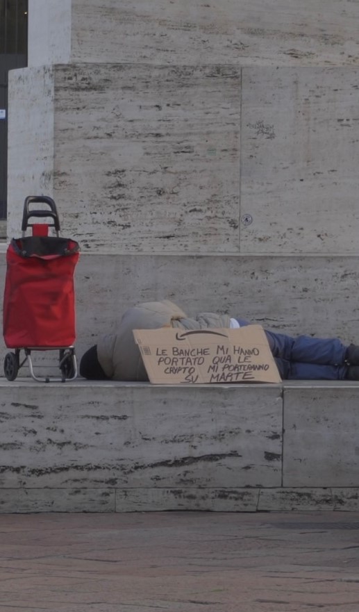CRYPTO/clochard 4/9 NFT Fourth of Nine Works extracted from the performance shot on 8-9 October 2021, with this cartoon he strongly attacks the banks, according to him they have made him poor and cryptocurrencies are the only hope "The banks brought me here crypto will take me to Mars" All the shots and videos were shot in utmost secrecy, so that none of the passers-by would notice anything and were faced with something unexpected and unreal, so as to arouse in the observers a sense of amazement and disbelief, as you will see in the other NFTs. In this NFT, the Italian Artist, finds himself resting for a couple of hours and begging in Piazza Affari under the Cattelan sculpture. Those who purchase the NFT will also have the framed, signed and authenticated painting of the same cardboard that the artist used in the performance in Milan ps. Part of the proceeds from the sale of the NFT will be donated to an association that helps and supports the homeless in the city of Milan YOU