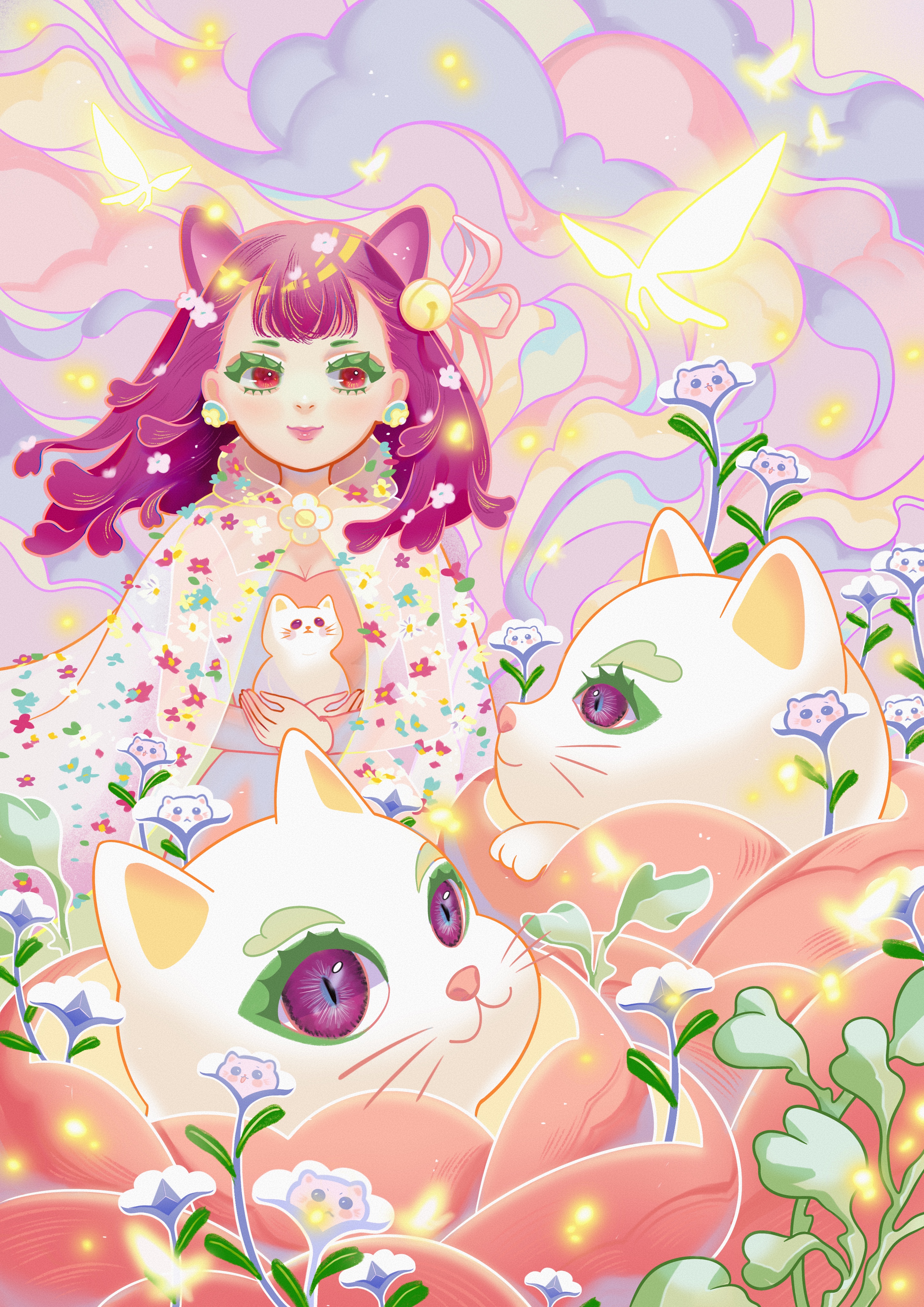 A yokai watch over cat spirits seeking nectar in a field of dreamy flowers. Playful adventure blooms in this prismatic realm. 2896 x 4096px art by enabeleno. This is a reimagined digital version of my unsold 2021 acrylic painting. The painting was part of our group exhibit with the theme Whimsical Furbabies.
