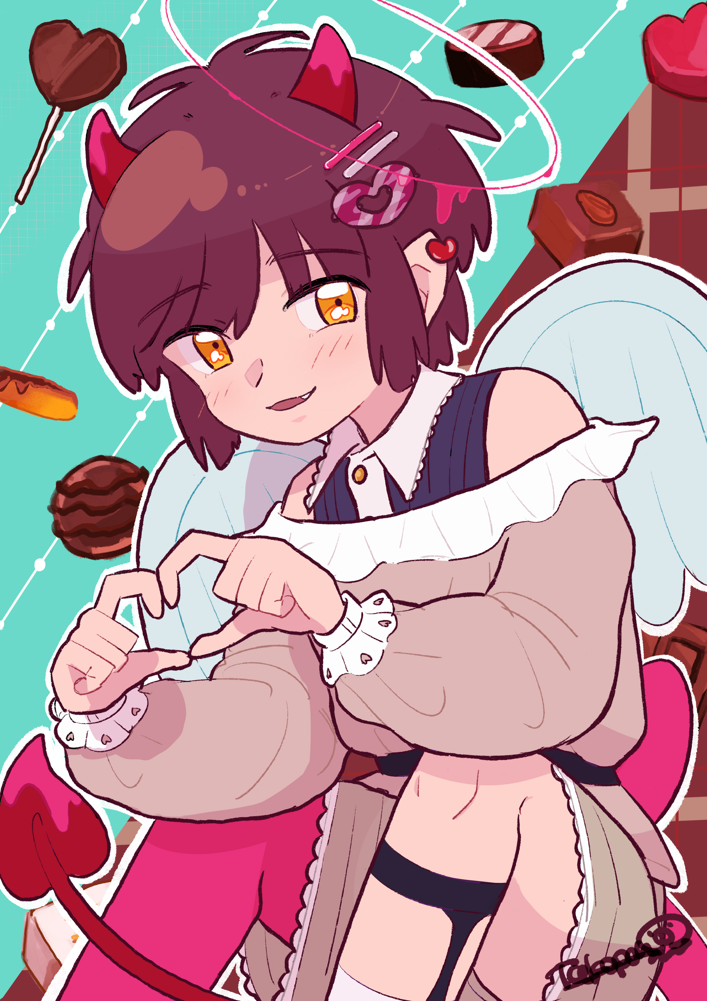 ハッピーバレンタインデー、2023。 近頃世間をお騒がせ中な恋のキューピッドの正体は小悪魔くん。 甘〜い恋心とチョコレートが彼の好物。 誠心誠意、お仕事させていただきます! Happy Valentine's Day, 2023! The true identity of Cupid in love, who has been causing a stir in the world lately, is a little devil boy. Sweet love and chocolate are his favorite foods. Sincerely, I will do my job!