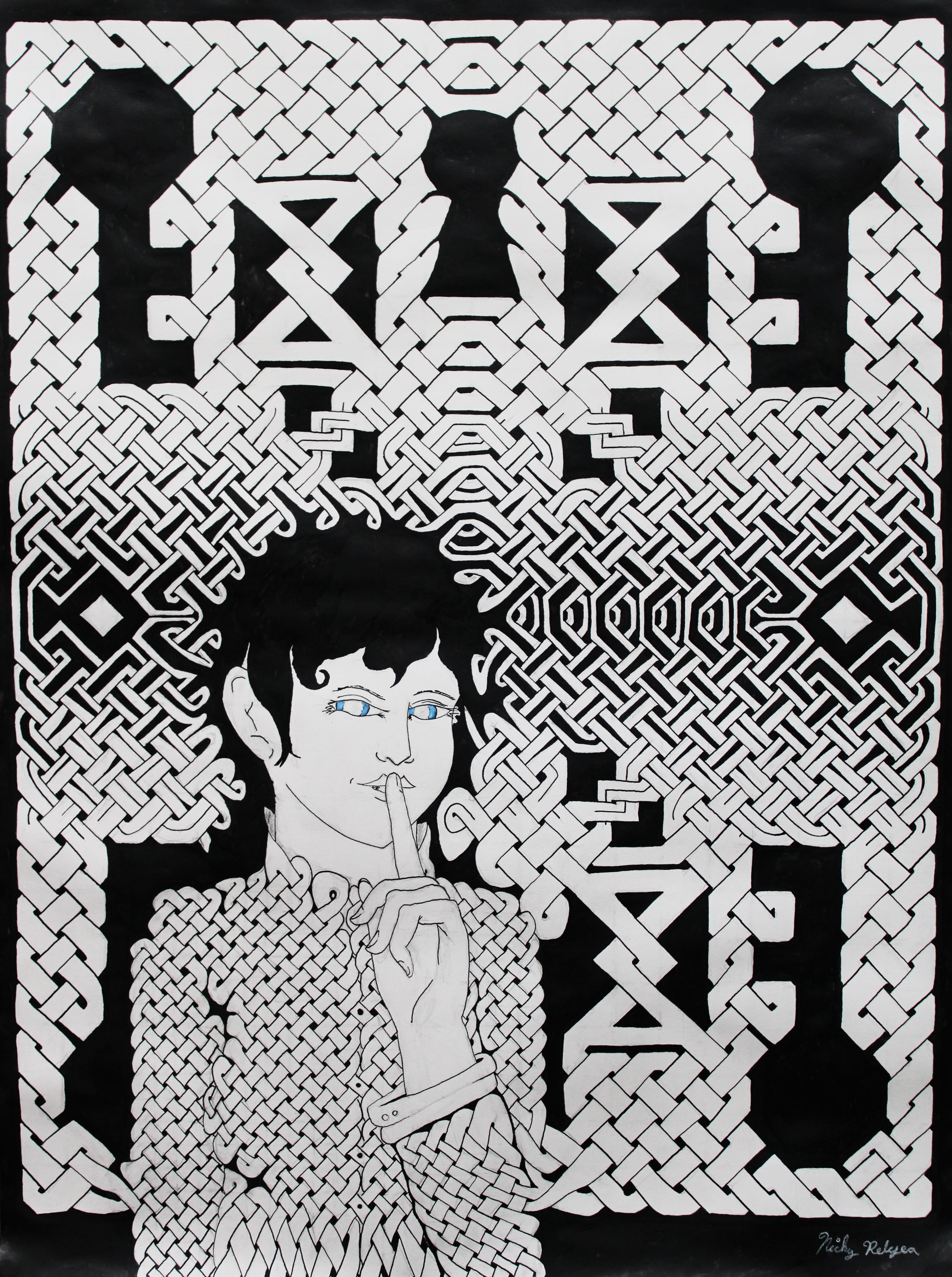 All she did was turn to me and I knew that it had begun. Calligraphy pens. Black Ink Blue ink 61cm by 45.7cm