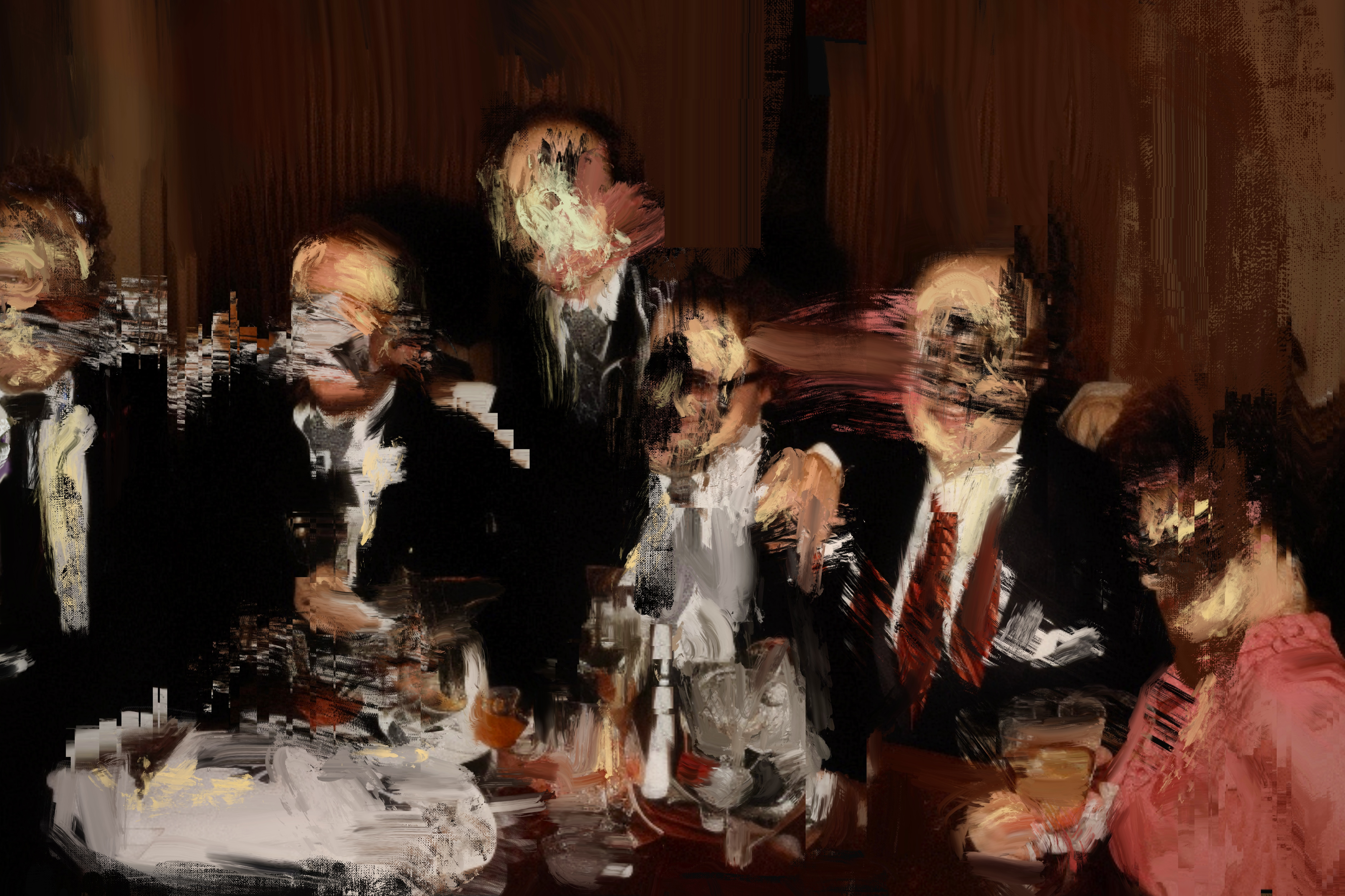"Bourgeoisie Dinner" is an unsettling painting that instantly captivates the viewer with its stark depiction of a group of men dressed in suits, gathered around a dinner table. Their blurred faces, painted abstractly, evoke a sense of emotional turmoil and disconnection, as the unnerving atmosphere challenges us to confront the darker aspects of societal norms and the human psyche. This striking composition is the work of Norman Harman, an artist who has masterfully transitioned from traditional oil painting to the cutting edge intersection of AI photography and digital painting. Drawing inspiration from the grotesque and raw emotional intensity of legendary painter Francis Bacon, Harman's innovative approach marries contemporary techniques with the rich tradition of figurative art. As a testament to his artistic evolution, "Bourgeoisie Dinner" brilliantly carries on the legacy of great figurative painters while embracing the limitless possibilities of the digital era. Harman's unique style and vision compel viewers to question the true nature of the bourgeois experience and explore the complexities of the human condition, making this piece an unforgettable addition to the ever-evolving world of digital art.